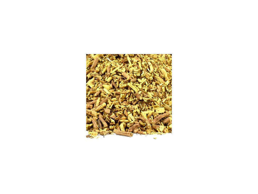 Sušený, řezaný kořen šišáku bajkalského (Scutellaria baicalensis Georgi).
