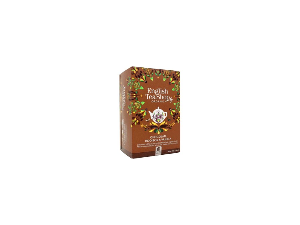 Bio bylinkový čaj s rooibosem, kakaem a vanilkovými lusky. v klasickém balení krabičky s 20 ks porcovaných nálevových sáčků