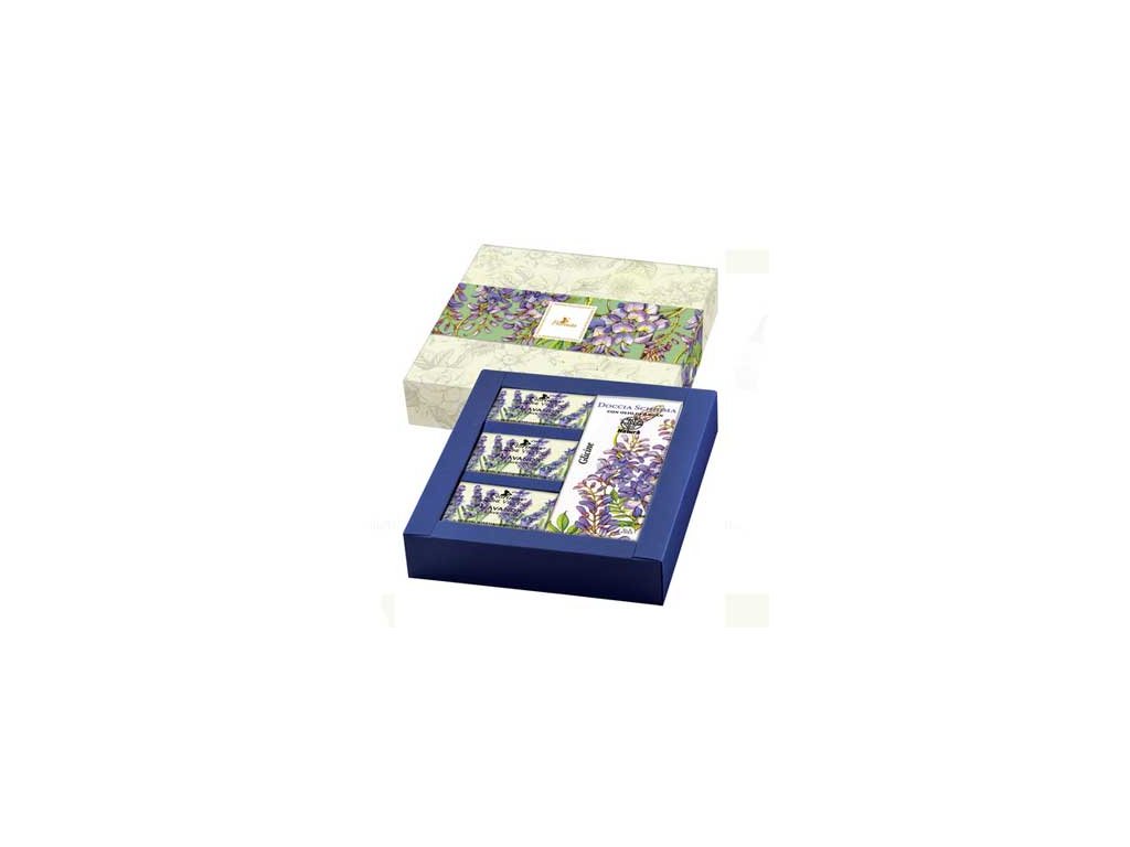 Dárkový set obsahuje Sprchovou pěnu Vistarie s arganovým olejem 200ml a 3x rostlinné mýdlo s vůní Lavandule 50g.